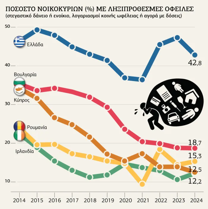 ● Το 42,8% των ελληνικών νοικοκυριών είχε το 2024 ληξιπρόθεσμες οφειλές για ενοίκιο ή στεγαστικό δάνειο, για λογαριασμούς κοινής ωφέλειας ή για δόσεις αγορών. Είναι το μακράν υψηλότερο ποσοστό στην Ε.Ε., καθώς η δεύτερη Βουλγαρία είχε ποσοστό 18,7% και η τρίτη Ρουμανία ποσοστό 15,3%.