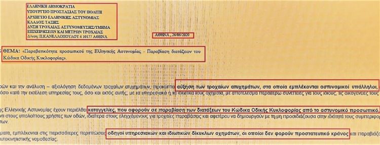Στο έγγραφο του αρχηγείου της ΕΛΑΣ που έχει συνταχθεί στις 26 Ιουνίου 2020 με τίτλο «Παραβατικότητα του προσωπικού της ΕΛΑΣ» και το οποίο αποκαλύπτει «Το Βήμα», σημειώνεται ότι «από τη μελέτη των σηματικών αναφορών και την ανάλυση αξιολόγηση δεδομένων τροχαίων ατυχημάτων προκύπτει αύξηση των τροχαίων ατυχημάτων στα οποία εμπλέκονται αστυνομικοί υπάλληλοι είτε αποκλειστικά είτε από κοινού με ιδιώτες τόσο κατά την εκτέλεση υπηρεσίας τους όσο και εκτός αυτής, με τα υπηρεσιακά και τα ιδιωτικά τους οχήματα. Με αποτέλεσμα περαιτέρω συνέπειες για τους ίδιους, τις οικογένειές τους και την υπηρεσία τους».