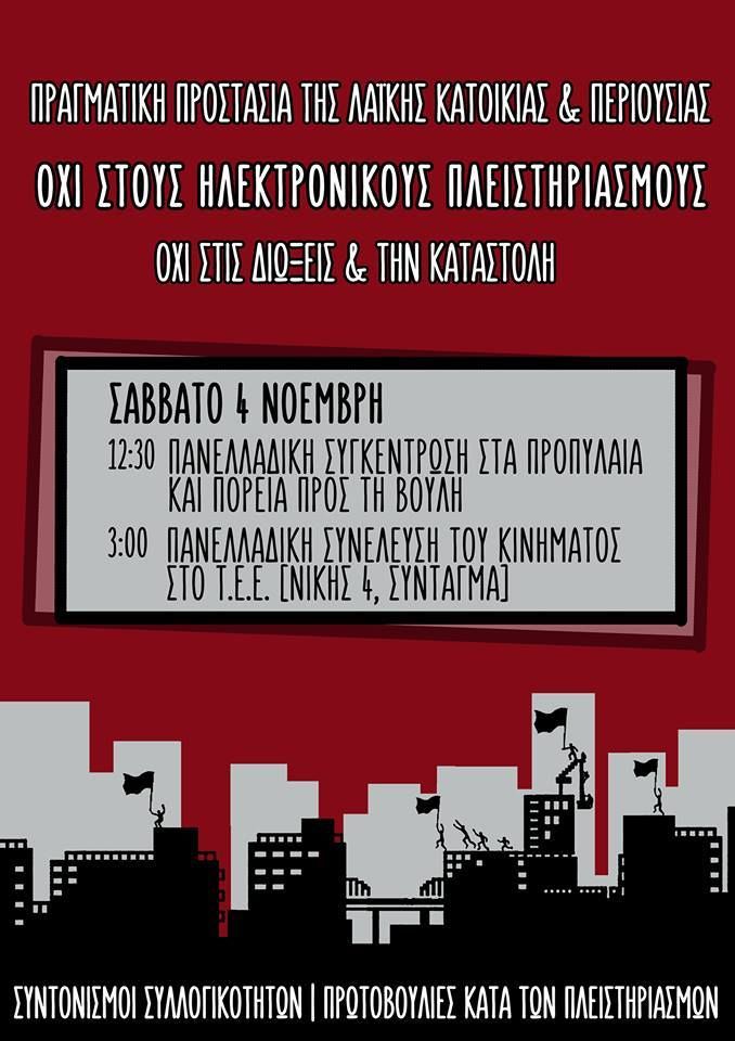 Το κίνημα κατά των πλειστηριασμών, μετά την πρώτη προσπάθεια πανελλαδικού συντονισμού στις 31 Αυγούστου, είναι ανάγκη σήμερα να κάνει νέα βήματα στην κατεύθυνση της διεύρυνσης του πανελλαδικού δικτύου συντονισμού και με νέες συλλογικότητες και πρωτοβουλίες, της κοινής επεξεργασίας των αιτημάτων και της οργάνωσης κοινών πολύμορφων δράσεων. Κινήσεις γειτονιάς, συντονισμοί συλλογικοτήτων και πρωτοβουλίες κατά των πλειστηριασμών από όλη την Ελλάδα καλούμε σε νέα πανελλαδική συγκέντρωση και συνέλευση, το Σάββατο 4 του Νοέμβρη, στην Αθήνα. Αγωνιζόμαστε και διεκδικούμε: