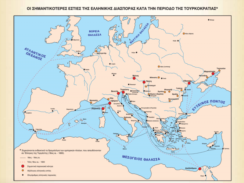«Η εκτέλεση από τους Τούρκους του εθνομάρτυρα και ευρωπαϊστή Ρήγα εντείνει τις προσπάθειες συστηματικότερης οργάνωσης των Ελλήνων του εξωτερικού. Στις ελληνικές παροικίες της Δυτικής Ευρώπης Έλληνες διανοούμενοι, σε επαφή με τα πολιτιστικά ρεύματα της εποχής, διεθνοποιούν το ελληνικό ζήτημα και διαδίδουν την ιδέα του νεοελληνικού έθνους, που έχει δικαίωμα σε χωριστή πολιτική ύπαρξη. Στο Παρίσι ιδρύεται το Ελληνόγλωσσο Ξενοδοχείο και στη Βιέννη η Φιλόμουσος Εταιρεία, δύο από τις προδρομικές οργανώσεις της Φιλικής Εταιρείας.