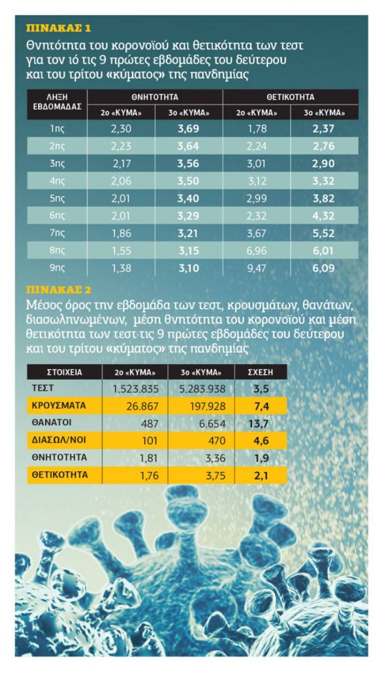 Στις δυο πρώτες στήλες του Πίνακα 1 δίνεται η θνητότητα του κορονοϊού τις 9 πρώτες εβδομάδες του δεύτερου και του τρίτου «κύματος» και στις δύο επόμενες η θετικότητα των τεστ.
