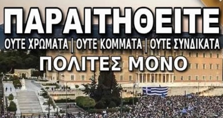 Tο παραμυθάκι που μας διηγήθηκαν στην αρχή οι «Παραιτηθείτε» («ούτε χρώματα, ούτε κόμματα, ούτε συνδικάτα») έχει, πια, χαθεί κάπου στο δρόμο προς την …αντίσταση. Κόμματα και χρώματα θα έχει η συγκέντρωση της Τετάρτης. Για συνδικάτα δεν έχουμε ακούσει κάτι, αλλά όλο και κάποια θα καλέσουν. Είναι από εκείνα τα συνδικάτα και τις ενώσεις που δεν κατέβαιναν ποτέ στο πεζοδρόμιο, παρά μόνο σε κινητοποιήσεις όπως αυτές των «Μένουμε Ευρώπη».