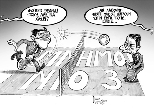 Ωραία ήταν η συζήτηση στην βουλή περί διαπλοκής. Γελάσαμε με την ψυχή μας, βλέποντας τους αρχηγούς των δυο μεγαλύτερων κομμάτων να παίζουν ένα παιχνιδάκι ανάμεσα σε κολοκυθιά και τέννις (εμπνευσμένη η γελοιογραφία τού Ιάκωβου Βάη στον σημερινό Ριζοσπάστη).