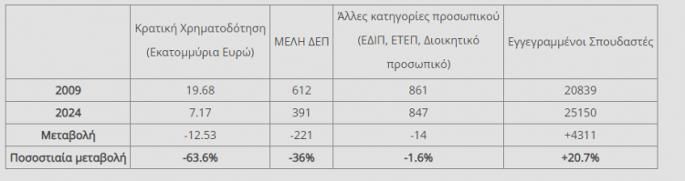 «Από τον πίνακα προκύπτει σαφώς ότι κατά την τελευταία 15ετία το ΕΜΠ υποχρεώθηκε σταδιακά να λειτουργεί με προϋπολογισμό μειωμένο κατά 63.6%, καθηγητικό προσωπικό μειωμένο κατά 36%, άλλο προσωπικό μειωμένο κατά 1.6% και αριθμό σπουδαστών αυξημένο κατά 20.7%.
