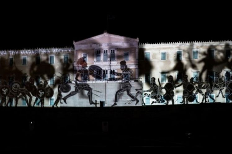 Και, βράδυ Σαββάτου σε μία άδεια Αθήνα με απαγόρευση κυκλοφορίας (ωπ!), παρακολουθήσαμε ένα ανεκδιήγητο σκηνικό που «έντυσε» για 4 λεπτά την πρόσοψη του κτιρίου της Βουλής.