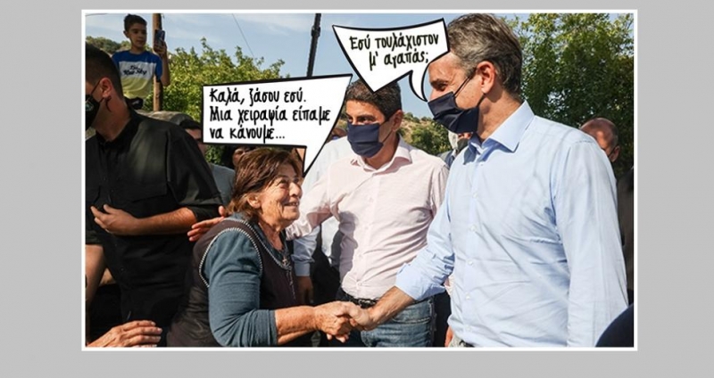 Από κοντά με τον Αδόλφο κι ο Κυριάκος. Τον έφτασαν στο αμήν! Αντί να πούνε «αφέντη μας, λαχτάρα μας, Πούλια κι Αυγερινέ μας», έστω ένα «μα τι γκομενάκι μούρλια είσαι εσύ!», τον φλόμωσαν στο μπίρι μπίρι: και δεν έχουμε λεφτά και με την πανδημία έκλεισαν τα μαγαζιά και κοιμόμαστε στα τσιμέντα. Και τι έχουν τα τσιμέντα δηλαδή; Μέχρι κι ο Παρθενώνας απέκτησε τα δικά του, στ’ Αρκαλοχώρι τούς βρομάνε; Μωρέ, να δείτε το βιντεάκι πρέπει. Πώς αλλάζει το βλέμμα του Μητσοτάρχα σαν γλώσσα δε βάζει μέσα η λεγάμενη (να δεις που ξενομπάτισσα θε να ’ναι, κι όχι ντόπια. Από την Ανω Συριζοραχούλα θα την έφεραν). Και δώσ’ του «δεν έχουμε» και πάρε «θέλουμε» και «ούτε κουβέρτες ήρθαν, ούτε τίποτα» και νισάφι πια! Πού νόμιζε ότι μιλάει; Στην πεθερά της και ζητάει τα πανωπροίκια;