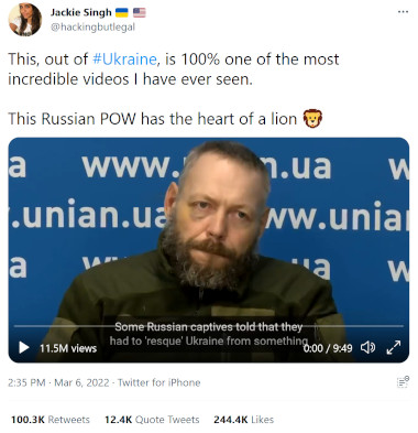 Η είδηση του μετανιωμένου Ρώσου στρατιώτη έκανε τον γύρο του διαδικτυακού χωριού, με τους φιλικά προσκείμενους στο Κίεβο χρήστες να μιλούν μεταξύ άλλων «για έναν γενναίο άνδρα με καρδιά λιονταριού».