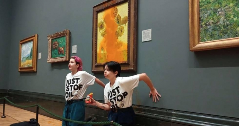 «Ω Θεέ μου!», λέει μία. «Σεκιούριτι!», φωνάζει άλλος. Η σούπα ντομάτας Heinz είχε ήδη πέσει πάνω στα «Ηλιοτρόπια» του Βαν Γκογκ στην Πινακοθήκη του Λονδίνου. Οι δύο νεαρές ακτιβίστριες κολλάνε τα χέρια τους (κυριολεκτικά) στον τοίχο και λένε: «Τι αξίζει περισσότερο; Η τέχνη ή η ζωή; Αξίζει περισσότερο η τέχνη από το φαγητό; Περισσότερο από τη δικαιοσύνη; Σας ενδιαφέρει περισσότερο η προστασία ενός πίνακα από την προστασία του πλανήτη και του ανθρώπου; Οι σοδειές καταστρέφονται, χιλιάδες άνθρωποι πεθαίνουν από την ξηρασία, τις φωτιές και τις πλημμύρες. Δεν μπορούμε να καταναλώνουμε άλλο ορυκτά καύσιμα. Διαφορετικά, θα χάσουμε κάθε τι που ξέρουμε και αγαπάμε».