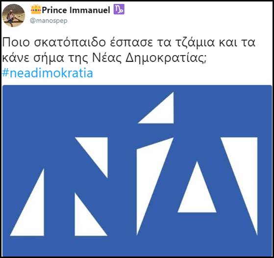 Ατέλειωτο “πανηγύρι” στήθηκε στα μέσα κοινωνικής δικτύωσης, ειδικά στο twitter, όταν έγινε γνωστό το νέο σήμα που παρουσίασε σήμερα ο Κυριάκος Μητσοτάκης μιλώντας στην εκδήλωση για τα 44 χρόνια της παράταξης,