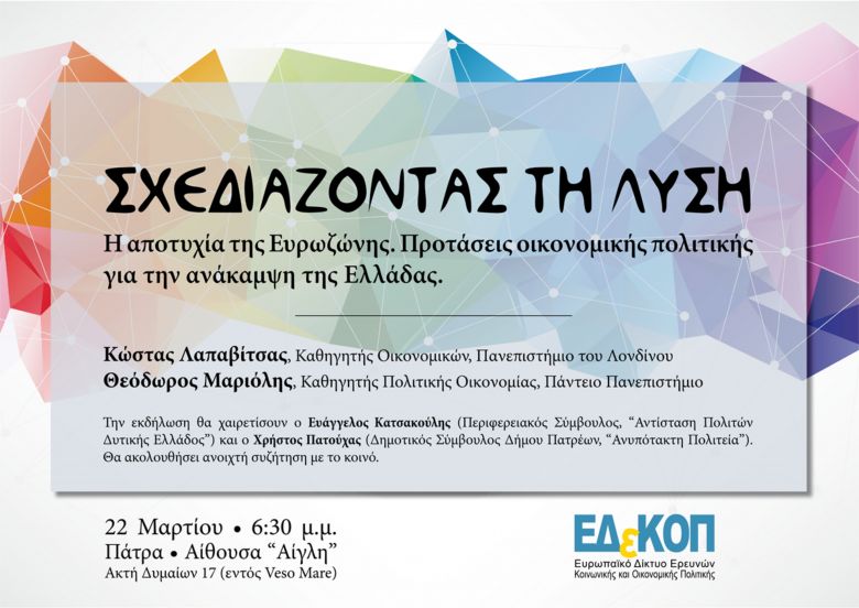 Μετά την παρουσίαση της μελέτης του Ευρωπαϊκού Δικτύου Ερευνών Κοινωνικής και Οικονομικής Πολιτικής για μία εφικτή αλλαγή πορείας στην Ελλάδα σε ειδική εκδήλωση στην Αθήνα, με μεγάλη προσέλευση φίλων και υποστηρικτών, το Δίκτυο θα πραγματοποιήσει ανοιχτή εκδήλωση και στην Πάτρα την Τετάρτη 22 Μαρτίου στις 6:30 μ.μ. στην αίθουσα Αίγλη στην Veso Mare με κεντρικούς ομιλητές τον Κώστα Λαπαβίτσα και το Θεόδωρο Μαριόλη.