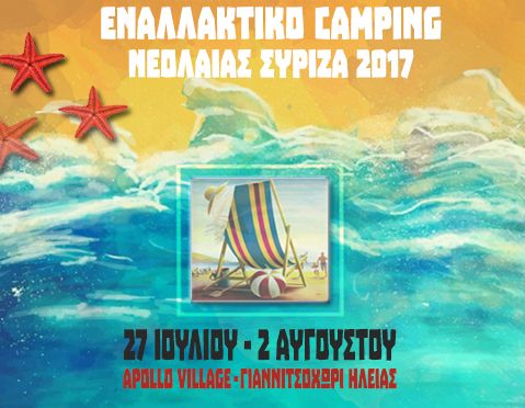 Το εναλλακτικό camping της Νεολαίας ΣΥΡΙΖΑ θα πραγματοποιηθεί φέτος από την Πέμπτη 27 Ιουλίου έως την Τετάρτη 2 Αυγούστου στο φιλόξενο χώρο του APOLLO VILLAGE στο Γιαννιτσοχώρι Ηλείας. Η διεξαγωγή του αναδεικνύει ένα διαφορετικό μοντέλο διακοπών, που δίνει έμφαση στην αξία της συλλογικής ζωής και βρίσκεται μακριά από λογικές εμπορευματοποιημένων προτύπων τουρισμού. Συνδυάζοντας τον αθλητισμό, τη διασκέδαση, τα πάρτι και τη θάλασσα, με μια σειρά από εκδηλώσεις, συζητήσεις και δραστηριότητες, μας επιτρέπει όχι μόνο να κάνουμε διακοπές με πολύ χαμηλό κόστος, αλλά ταυτόχρονα να προβληματιστούμε και να ανταλλάξουμε απόψεις πάνω στα βασικά ζητήματα της καθημερινότητάς μας.