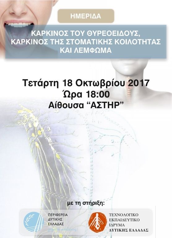 Η Περιφέρεια Δυτικής Ελλάδας, Ο Όμιλος Εθελοντών κατά του Καρκίνου «ΑγκαλιάΖΩ» Νομού Αχαΐας, ο Όμιλος Συναδελφικών Εκδηλώσεων Προσωπικού & Συνταξιούχων Ν. Αχαΐας, ο Σύλλογος Συνταξιούχων ΔΕΗ Πελοποννήσου, Αιτωλοακαρνανίας, Ηπείρου & Ιονίων Νήσων και το Τεχνολογικό Εκπαιδευτικό Ίδρυμα Δυτικής Ελλάδας συνδιοργανώνουν ενημερωτική ημερίδα με θέμα «Καρκίνος του Θυρεοειδούς, Καρκίνος της Στοματικής Κοιλότητας & Λέμφωμα».