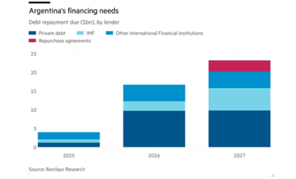 Από τον Σεπτέμβριο του 2026, θα λήξουν μεγάλες υποχρεώσεις εξυπηρέτησης του χρέους σε ξένο νόμισμα προς ιδιώτες ομολογιούχους. Η Αργεντινή έχει χρέος 95 δισ. δολάρια σε δολάρια και ευρώ, έναντι καθαρών αποθεματικών μόλις 6 δισ. δολάρια, σύμφωνα με την Barclays. Και πρέπει να αποπληρώσει χρέη αξίας 44 δισ. δολαρίων από τώρα μέχρι το τέλος της θητείας του Μιλέι το 2027. Επομένως, ο Μιλέι δεν μπορεί να αντέξει να χρησιμοποιήσει τα ελάχιστα συναλλαγματικά αποθέματα για να στηρίξει το πέσο.