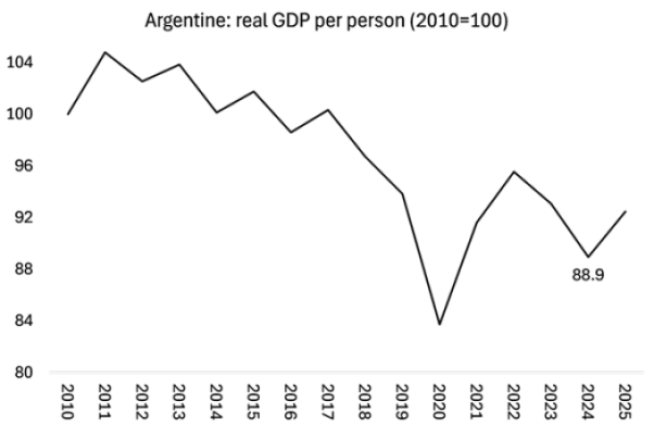 Και αυτή είναι η μακροπρόθεσμη ιστορία του καπιταλισμού στην Αργεντινή. Η οικονομία έχει ουσιαστικά παραμείνει στάσιμη μετά το τέλος της Μεγάλης Ύφεσης το 2008-9, και ιδιαίτερα μετά από το τέλος της παγκόσμιας έκρηξης των τιμών των εμπορευμάτων το 2012. Στα 13 χρόνια από το 2012 έως το 2024, ο μέσος όρος της πραγματικής αύξησης του ΑΕΠ ήταν μόλις 0,1%. Η βιομηχανική παραγωγή μειώνεται και η κατανάλωση των νοικοκυριών είναι στάσιμη, με πτώση των λιανικών πωλήσεων. Αυτό δεν αποτελεί έκπληξη, δεδομένου ότι οι μισθοί του δημοσίου έχουν μειωθεί κατά 33,8% σε πραγματικούς όρους και οι Αργεντινοί αναγκάζονται να βρουν «άτυπη» εργασία όσο περισσότερο μπορούν.