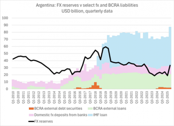 Τα συναλλαγματικά αποθέματα της Αργεντινής είναι σήμερα χαμηλότερα από ό,τι το 2018, παρά τα τεράστια δάνεια που έχει χορηγήσει το ΔΝΤ από τότε. Ο πρώην πρόεδρος Μαουρίσιο Μάκρι δανείστηκε 50 δισ. δολάρια εκείνη τη χρονιά —το μεγαλύτερο πακέτο διάσωσης που έχει χορηγήσει ποτέ το Ταμείο— πριν η πολιτική του πτώση εκτροχιάσει το πρόγραμμα του ΔΝΤ και πλήξει το νόμισμα. Τώρα, αφού ληφθούν υπόψη τα δάνεια του ΔΝΤ και οι υποχρεώσεις όπως τα swap line από την Κίνα, τα αποθέματα της Αργεντινής παρέμειναν σε μεγάλο βαθμό αρνητικά φέτος, παρά το γεγονός ότι το ΔΝΤ προχώρησε σε προκαταβολή περισσότερου από το ήμισυ ενός νέου πακέτου διάσωσης ύψους 20 δισ. δολαρίων.