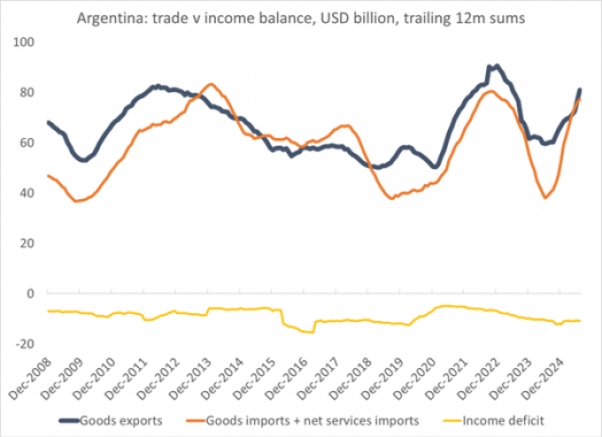 Μόλις οι επενδυτές έπαιρναν στα χέρια τους τα δολάρια σε συνάλλαγμα, τα έβγαζαν αμέσως από τη χώρα. Το 2024, οι εξoχώριες επενδύσεις ανήλθαν συνολικά σε 3,3 δισ. δολάρια (Αργεντινοί που πραγματοποίησαν επενδύσεις χαρτοφυλακίου στο εξωτερικό) και σημειώθηκε μείωση 1,4 δισ. δολαρίων στις ξένες επενδύσεις χαρτοφυλακίου στη χώρα, με αποτέλεσμα συνολική εκροή 4,7 δισ. δολαρίων. Μέχρι στιγμής, το 2025, άλλα 2,6 δισ. δολάρια έχουν φύγει από τη χώρα. Αυτή η διαρροή δολαρίων είναι μη βιώσιμη.