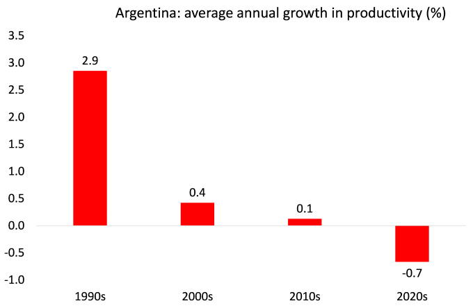 Όπως έχει επισημάνει ο Αργεντινός μαρξιστής οικονομολόγος Ρολάντο Ασταρίτα, η υποκείμενη αδυναμία της Αργεντινής σχετίζεται με την τεχνολογική και παραγωγική καθυστέρηση. Με εξαίρεση τους τομείς όπου η Αργεντινή έχει φυσικά πλεονεκτήματα, όπως η ενέργεια από την περιοχή Vaca Muerta ή τα συγκροτήματα σόγιας και καλαμποκιού, οι προδιαγραφές παραγωγικότητάς της είναι χαμηλά σε σχέση με τις διεθνείς. Ακόμη και στη σόγια, το σιτάρι και το καλαμπόκι, η παραγωγικότητα είναι χαμηλότερη από εκείνη των παραγωγών των ΗΠΑ. Αυτές οι διαφορές οφείλονται ουσιαστικά στις διαφορές στο επίπεδο των επενδύσεων στις εισροές και την τεχνολογία.